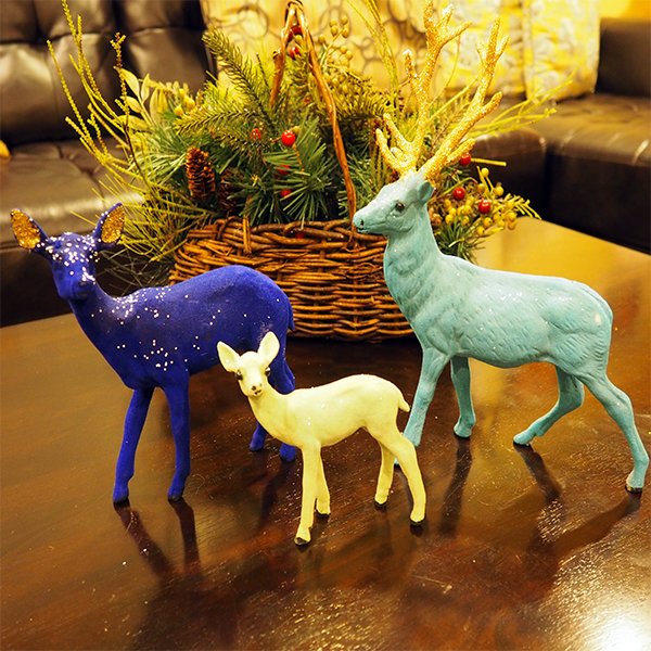 Checkout this colorful flocked deer family painted in brilliant coloration and spritzed with glitter and snowflakes. It looks so adorable, this colorful flocked deer family invites a vibrant glow in your mantle and tabletop displays. Buy for this Christmas and make your decorations more vibrant. Buy this deer family of mom, dad and baby flocked deer family for your Holiday decor, available in pink, purple, yellow or blue with glitter and snowflake accents.