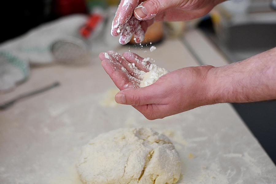Close up human hands making pastry from raw dough/ Bread making process. Closeup of man hands kneading dough. Baker cooking pastry. Culinary courses and food preparation.